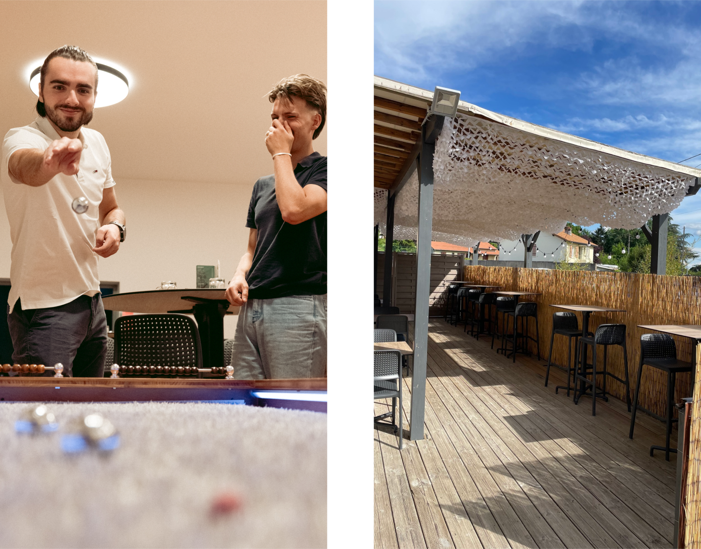 Le restaurant dispose de deux zones distinctes : un espace repas aux tables basses pour une ambiance détendue, et un espace “pétanque” avec des tables hautes pour les groupes et les amateurs de jeux.